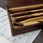Potrai ricevere il tuo pen holder singolo in una elegante scatola rigida di cartone telato, con uno scompartimento calamitato in cui poter riporre i tuoi pennini.